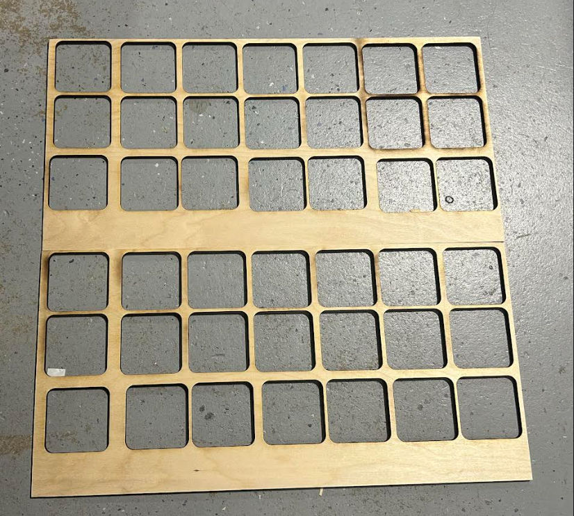 Other than this, I worked on the word clock project with Kim. I helped her remove each letter block that we had already placed, and tape down the LED's onto the board. We decided to tape the LED's down because they would just move around in the blocks and we didn't want it to affect how the letters looked when the LED's were on. I also helped her cut out a bunch of the 1/4" wood pieces and screw in more letter blocks. With the wood pieces that I cut out, we were able to make about 20 more letter blocks and attach them onto the board. Now, all we have to do is cut out the rest of the 1/4" wood pieces and the white acrylic for the blank boxes, and we'll be ready to test the code on the board.